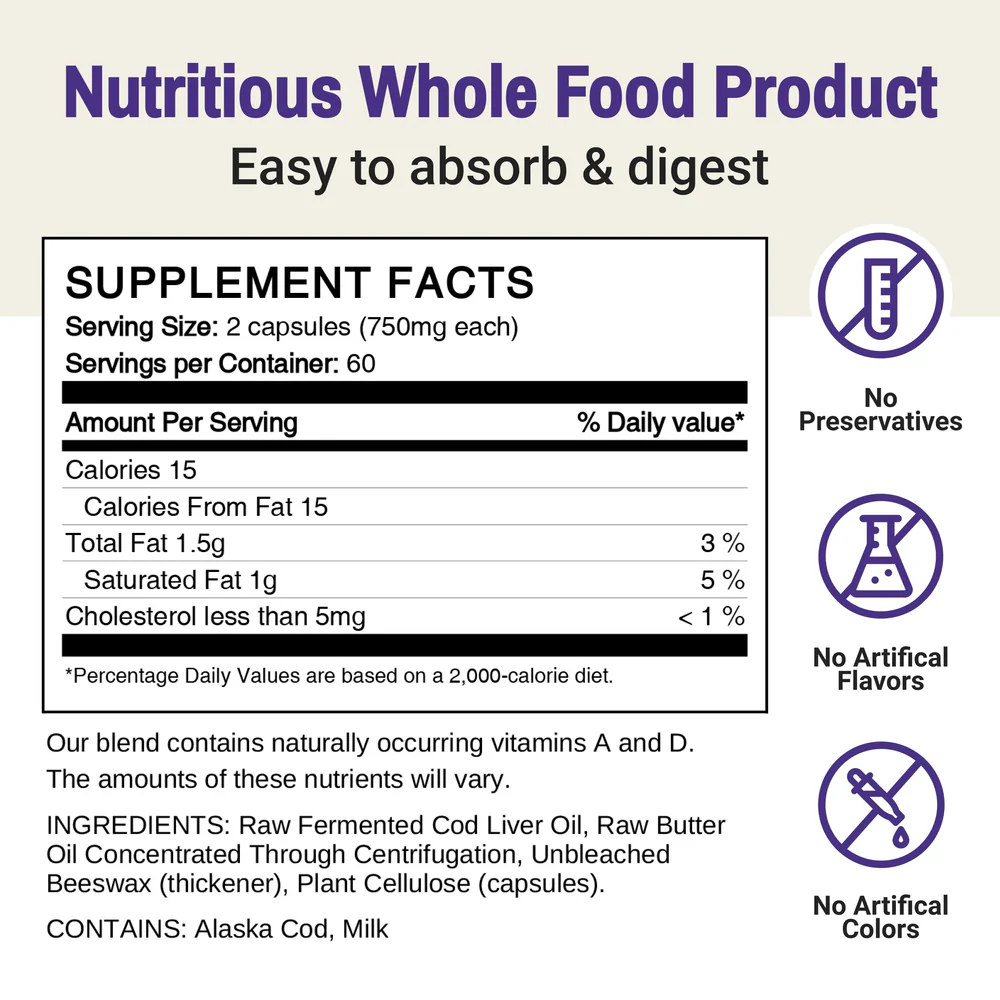 The product is a potent blend of cod liver oil and nourishing butter oil that can take six months to produce. The capsules include no synthetic additives and solely natural vitamins and nutrients. Furthermore, cod liver oil has no unpleasant taste because the product is delivered in capsule form.