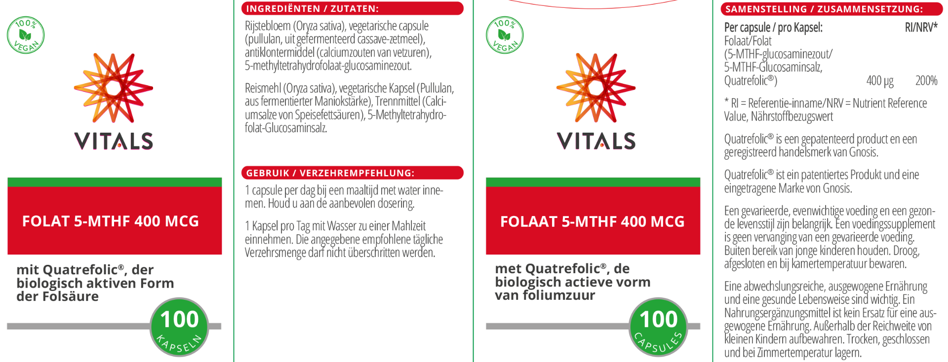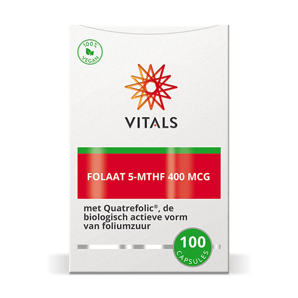 Folic acid (also called vitamin B11 or vitamin B9 in Germany and the US) occurs in food as several forms of folate, including the most biologically active form 5-methyltetrahydrofolate (5-MTHF). This is the body's own form in which folate circulates in the blood. Folic acid is the name for the synthetic pteroylmonoglutamic acid, which is used as a source of folate in most folic acid supplements. The compound pteroylmonoglutamic acid is the most oxidized form of folate, and as such is hardly present in food. The problem with folic acid is that the conversion into the biologically active 5-MTHF is difficult for a relatively large group of people, as a result of which supplementation may have an insufficient effect and, moreover, an undesired accumulation of unmetabolized folic acid may occur. For these reasons, Vitals only uses Quatrefolic®, which consists of 5-MTHF bound to glucosamine salt.